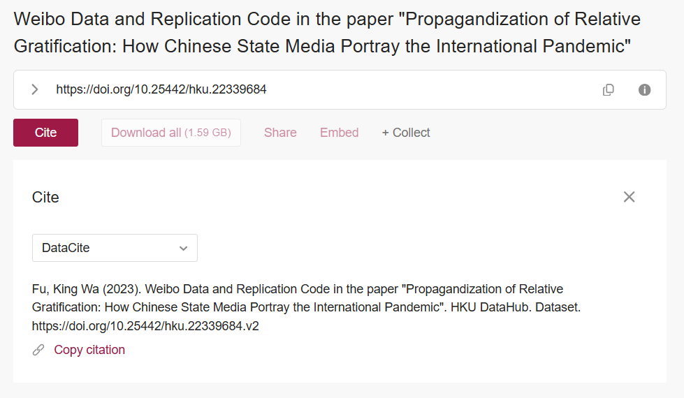 In DataHub, the institutional data repository of the University of Hong Kong, a data citation can be copied by clicking “Cite” on the item record page and selecting from a range of citation styles, including but not limited to APA, Chicago, and MLA.
